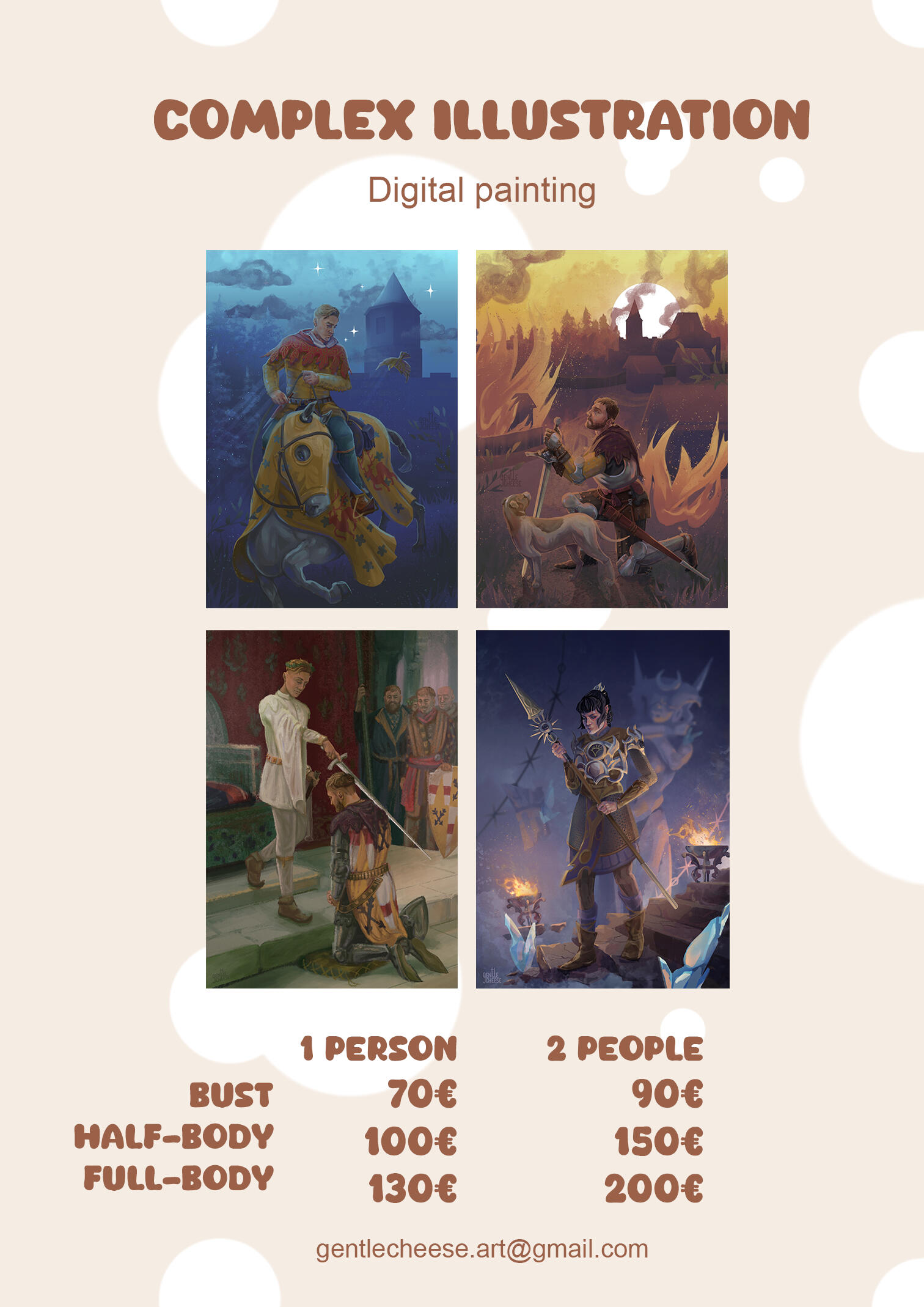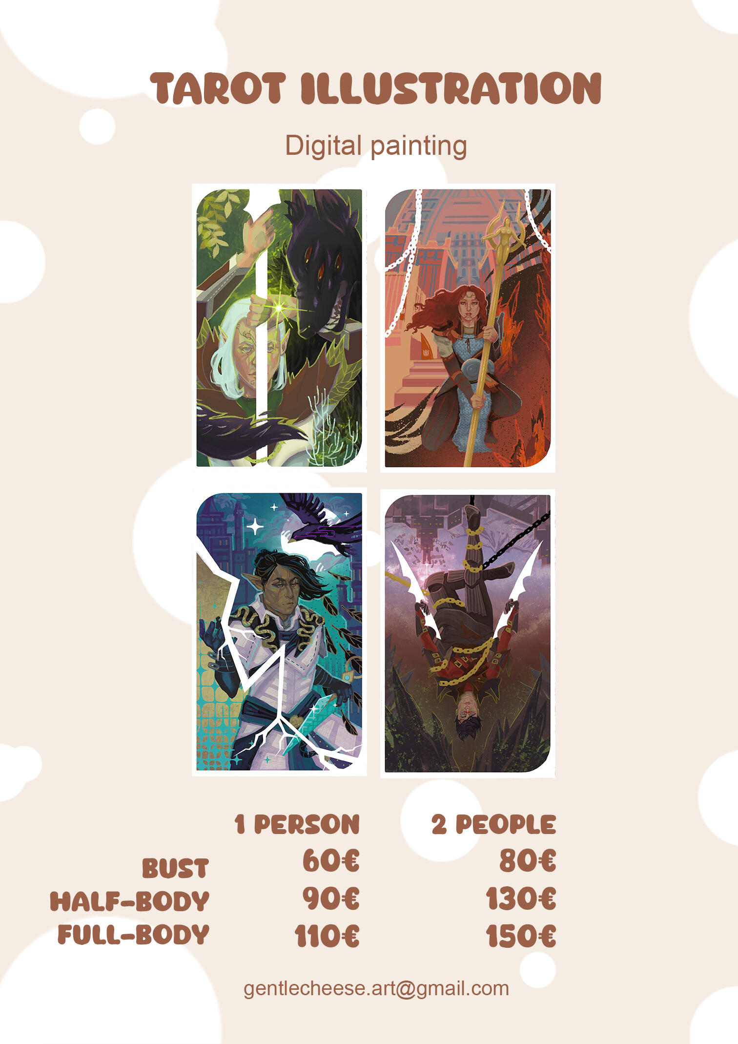 Prices listed are the starting point and apply to commissions for personal purposes, commercial work is priced individually based on the project type.The artist keeps all of the intellectual property rights to the produced artwork and can use it for marketing and other purposes, unless agreed on a special lisence or an NDA.By ordering a traditional painting with shipping, the customer becomes responsible to accept the delivery and pay any taxes, duties and fees that might be applicable upon delivery.You can request other types of artwork (sketches, portraits, simple or no background character art, more characters) than the ones present in the commission sheet and get an individual price estimate.You can request commissions on my Vgen, Ko-Fi or Etsy; or just send me an email: [email protected]